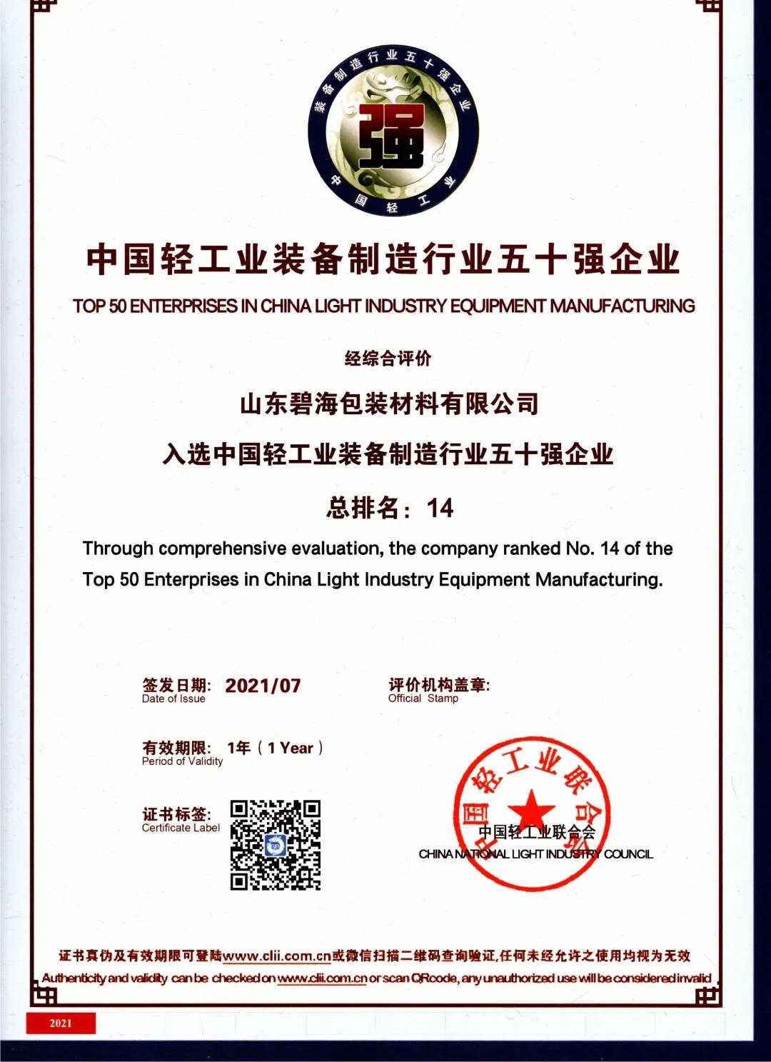 2021年7月20日,在北京召開的“奮進(jìn)‘十四五’領(lǐng)航新消費(fèi)”中國輕工業(yè)百強(qiáng)企業(yè)高峰論壇上,碧海公司入選中國輕工業(yè)裝備制造行業(yè)五十強(qiáng)企業(yè)(排名14)、中國液態(tài)食品機(jī)械行業(yè)十強(qiáng)企業(yè)(排名4),這是對我公司綜合實(shí)力、創(chuàng)新成就的高度肯定和認(rèn)可。
