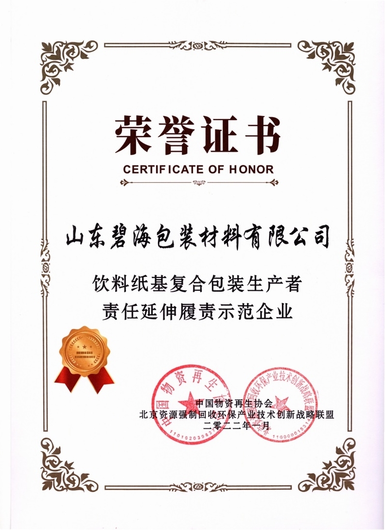 2022年1月12日,中國飲料紙基復(fù)合包裝可持續(xù)發(fā)展協(xié)作體2021年度會(huì)議在北京召開。會(huì)議對(duì)碧海公司在2021年推行環(huán)境友好包裝設(shè)計(jì)、開發(fā)可再生原料包裝、共建飲料紙基復(fù)合包裝回收協(xié)作體、規(guī)范回收利用等方面的工作給予了肯定,授予“飲料紙基復(fù)合包裝生產(chǎn)者責(zé)任延伸履責(zé)示范企業(yè)”榮譽(yù)稱號(hào)。