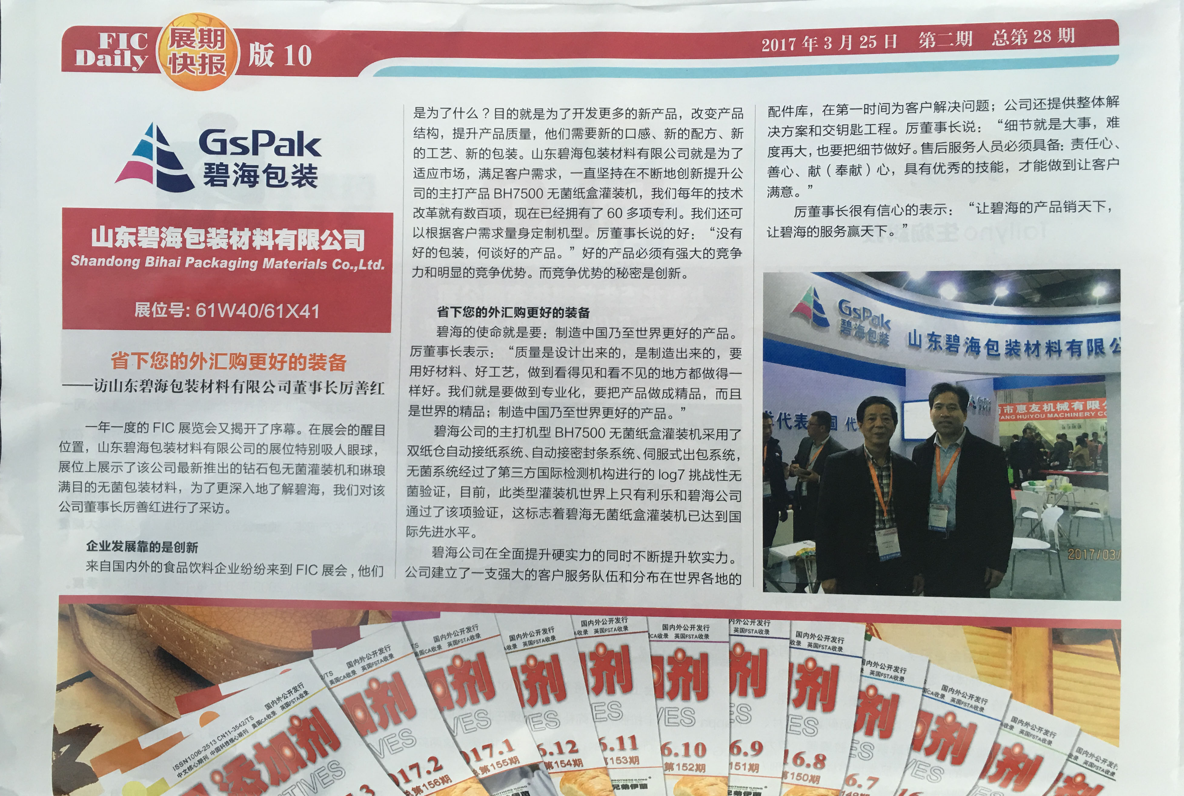 一年一度的FIC展覽會(huì)又揭開了序幕。在展會(huì)的醒目位置,山東碧海包裝材料有限公司的展位特別吸人眼球,展位上展示了該公司最新推出的鉆石包無菌灌裝機(jī)和琳瑯滿目的無菌包裝材料,為了更深入地了解碧海,我們對(duì)該公司董事長(zhǎng)厲善紅進(jìn)行了采訪。